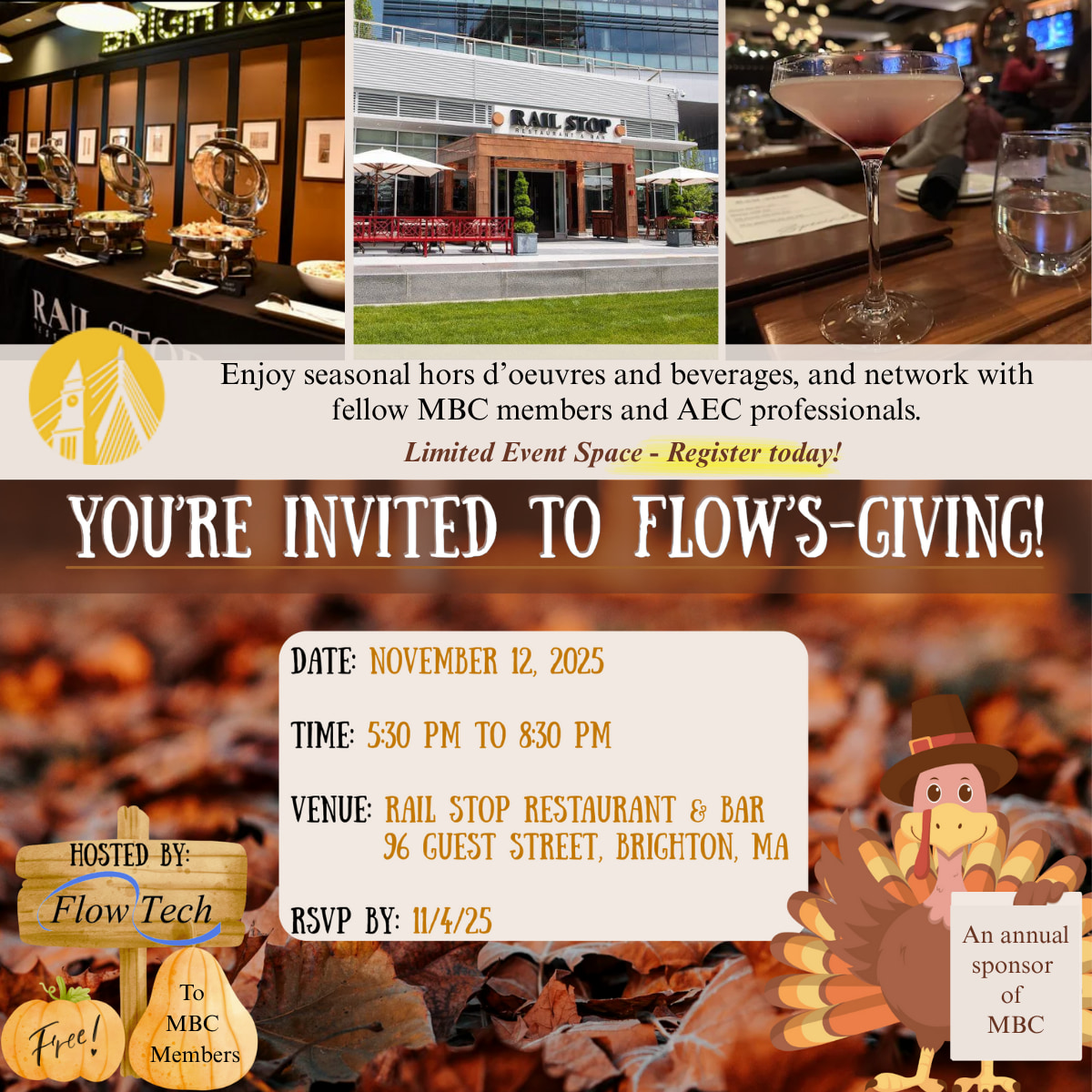 The Massachusetts Building Council (MBC) is proud to help promote Flow Tech’s Flow’s-giving 2025 - a Thanksgiving-inspired networking event welcoming Flow Tech as a new member and Annual Sponsor!